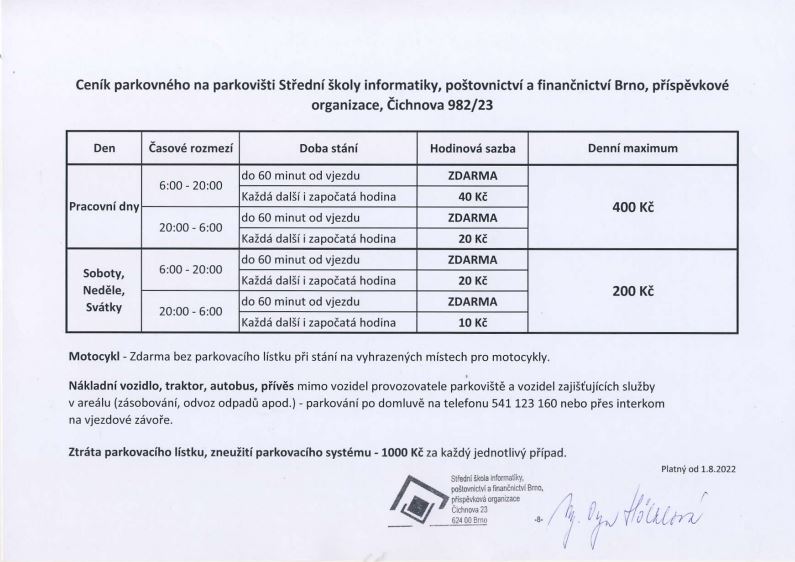 Vozem se k nám dostanete z ulice Veslařská – asi 200 metrů od BS Auto Brno, které je dobrým orientačním bodem. Asi 50 metrů před kruhovým objezdem odbočíte na ulice Podveská a nejbližší odbočkou vpravo pak přímo vjedete do areálu školy. Parkovat lze přímo v jejím areálu, kde naleznete parkoviště s velkou kapacitou a nemusíte tak mít obavu z hledání volných parkovacích míst. Od roku 2019 je parkoviště zpoplatněno, viz ceník, který naleznete na tomto linku.